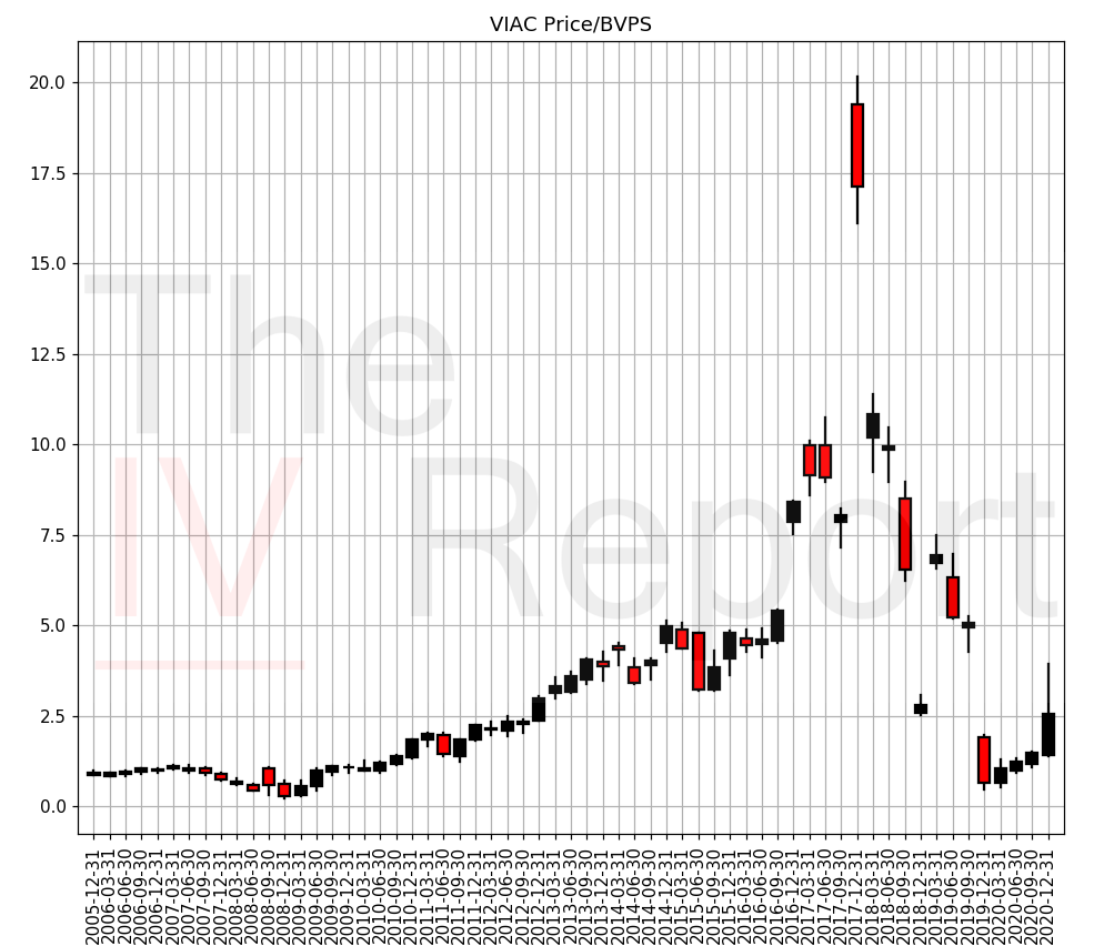 Let’s take ViacomCBS first. One of the reasons for its selloff was that the company is planning to sell new shares. The actual reason for the price drop is immaterial for our analysis, however. The real danger here is that the stock was very overvalued before it started to drop and is still over its intrinsic value now. To prove this, I will not actually calculate the IV; instead I will defer to the PB ratio. The PB ratio for ViacomCBS is shown in Figure 1 below.