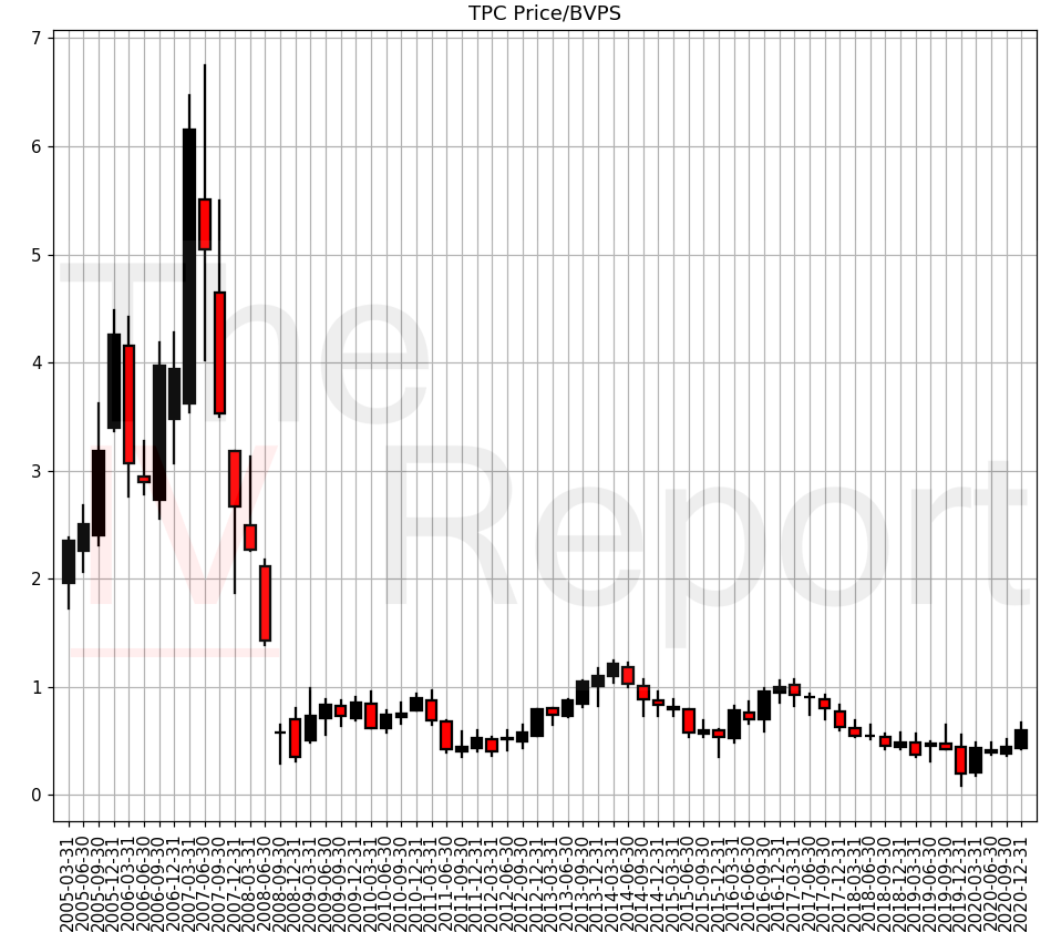 Over the last 12 or so years, the PB ratio has peaked around 1.25. If the price were to reach my IV of $35, it would represent a PB of 1.2. Thus, I think $35 is an appropriate price target for TPC. Of course, if TPC were to reach $35, it would break through the channel in Figure 1 that I discussed. My guess is that at that point, the ridiculously bullish technicals would drive further buying and push the price even higher. If I were trading this stock (which I probably will be at some point), I would almost certainly hold some TPC past my price target and wait for the speculative demand to kick in and take it higher.