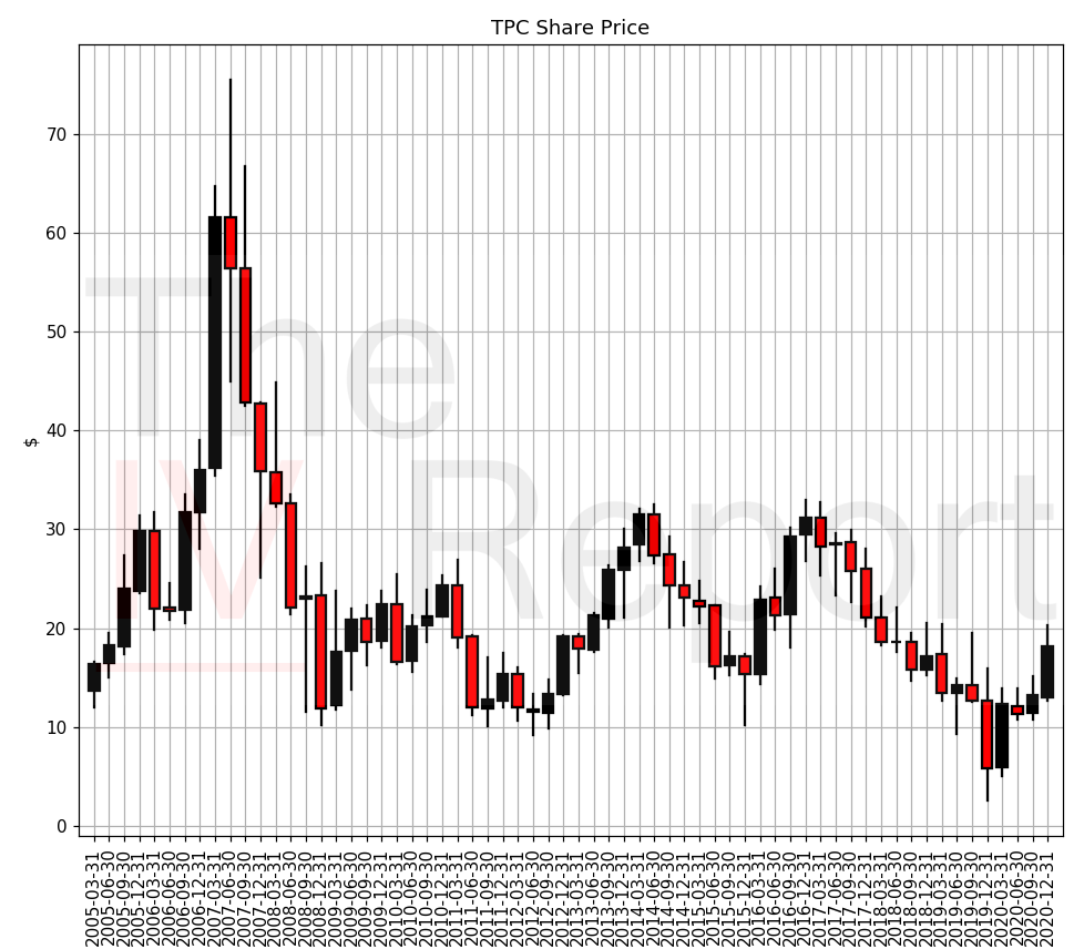 The TPC share price is plotted in Figure 1 below. The main action here is the channel that the stock has been in since the 2008 crash. We will come back to this channel at the end of the article. Currently, the stock is still rising from its COVID lows.