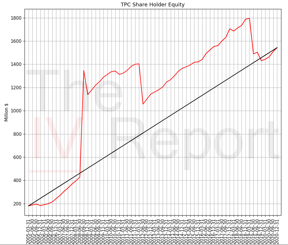 To get the intrinsic value of TPC, we need to model the future increases in its share holder equity and its future dividends, as I described in my value investing article. TPC does not pay a dividend, so we will ignore it and only look at the share holder equity. It is plotted in red in Figure 2. Just like most other stocks, the most appropriate model for TPC’s share holder equity is a linear one, which I have plotted in black. Now, the actual line does not matter here for our IV calculation. It is just there for comparison with the reported data. Only the slope is used; here, the slope is $21.6 million per quarter.